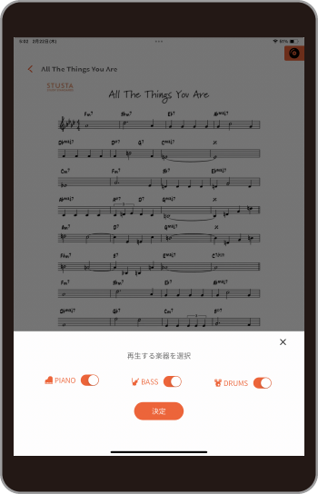 ベースまたはドラムをオフにした場合は、オフにした対象パートを練習することを想定し、ピアノが主旋律を担うピアノトリオの音源に自動的に切り替わります。